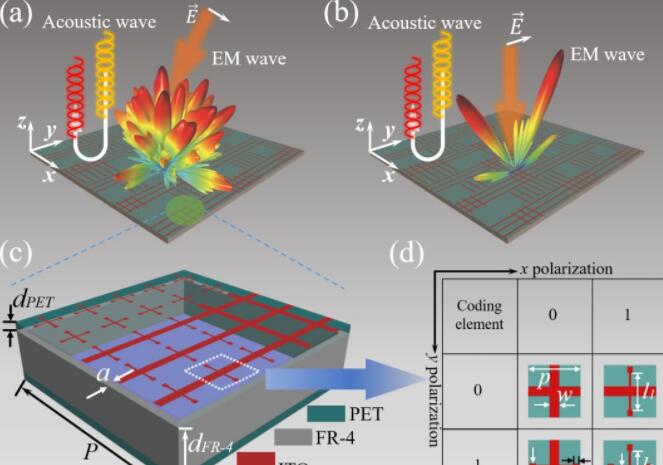 超材料是一種由亞波長單元結(jié)構(gòu)經(jīng)周期或非周期排布構(gòu)成的特殊人造材料,具有一些自然界中材料所不具備的特異性物理響應(yīng)特性,在信息、物理等領(lǐng)域受到廣泛關(guān)注。然而,目前的研究大多局限于超材料對(duì)單一物理場的調(diào)控,如電磁場、靜電場、聲場等,而對(duì)于多物理場調(diào)控則鮮有提及。為了探索電磁場與聲場復(fù)合調(diào)控的可行性,本文提出了一種新型超材料,通過將典型雙薄膜型隔聲結(jié)構(gòu)與數(shù)字編碼超材料有機(jī)結(jié)合,最終在實(shí)現(xiàn)優(yōu)異降噪性能的同時(shí),對(duì)不同極化入射電磁波的散射特性可進(jìn)行獨(dú)立的控制,具有很高的工程應(yīng)用價(jià)值。
